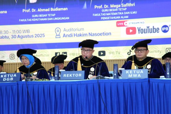Rektor IPB University Prof. Dr. Arif Satria mengapresiasi atas lahirnya empat guru besar baru yang menyampaikan orasi ilmiah pada Sidang Terbuka Guru Besar IPB University, Sabtu (16/8/2025) Auditorium Andi Hakim Nasution, Kampus IPB Dramaga, Bogor. Orasi ilmiah ini menunjukkan komitmen IPB University dalam memberikan solusi lintas disiplin untuk menjawab tantangan pembangunan nasional, dari sektor pertanian,…