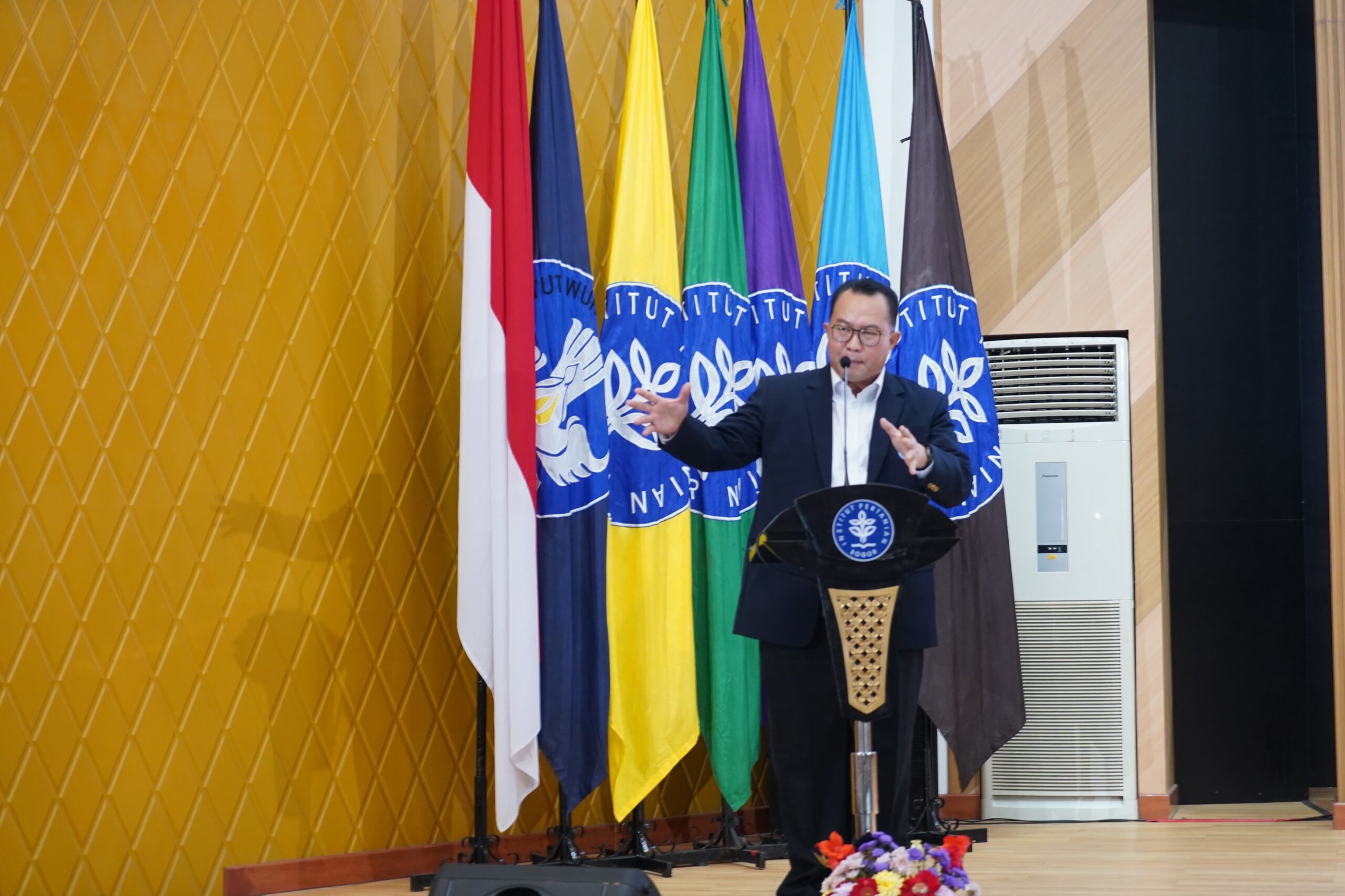 Rektor IPB University Prof. Dr. Arif Satria membuka rangkaian Dies Natalis ke-62 IPB University bertema “Agromaritim 5.0 Berdampak, Inspirasi Indonesia”. Dalam pidatonya, Prof. Arif menyampaikan ke depan riset IPB akan fokus pada tiga hal yaitu bidang omics (omiks), Artificial Intelligent (AI), dan sustainability (keberlanjutan).