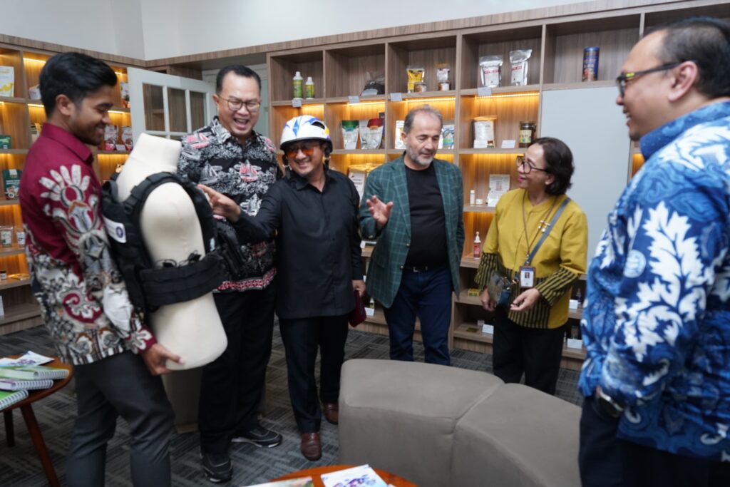 Di samping itu, Prof. Arif juga mengenalkan produk hasil hilirisasi kelapa sawit. Salah satunya adalah helm dan rompi anti peluru yang terbuat dari tandan kosong kelapa sawit, yang dikembangkan oleh tim peneliti IPB University yang dipimpin oleh Dr. Siti Nikmatin dari Departemen Fisika, FMIPA.