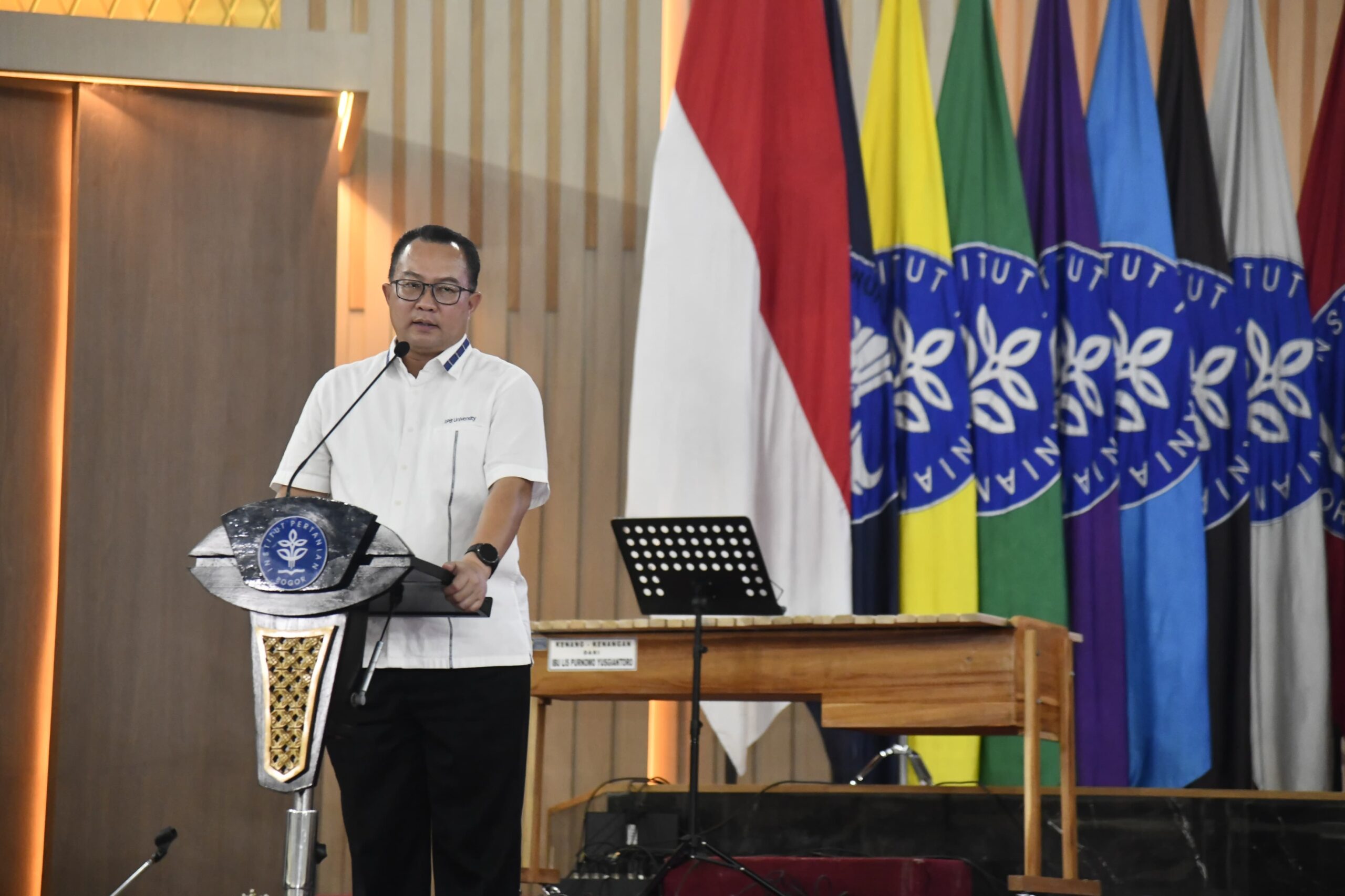 Rektor IPB University Prof. Dr. Arif Satria menyampaikan apresiasi tinggi terhadap peran aktif Agrianita dalam mendukung keluarga besar IPB. Prof. Arif menyoroti kontribusi nyata Agrianita selaku Dharma Wanita Persatuan (DWP) IPB dalam mendukung pendidikan, kesehatan, lingkungan, hingga ekonomi keluarga pegawai IPB University.