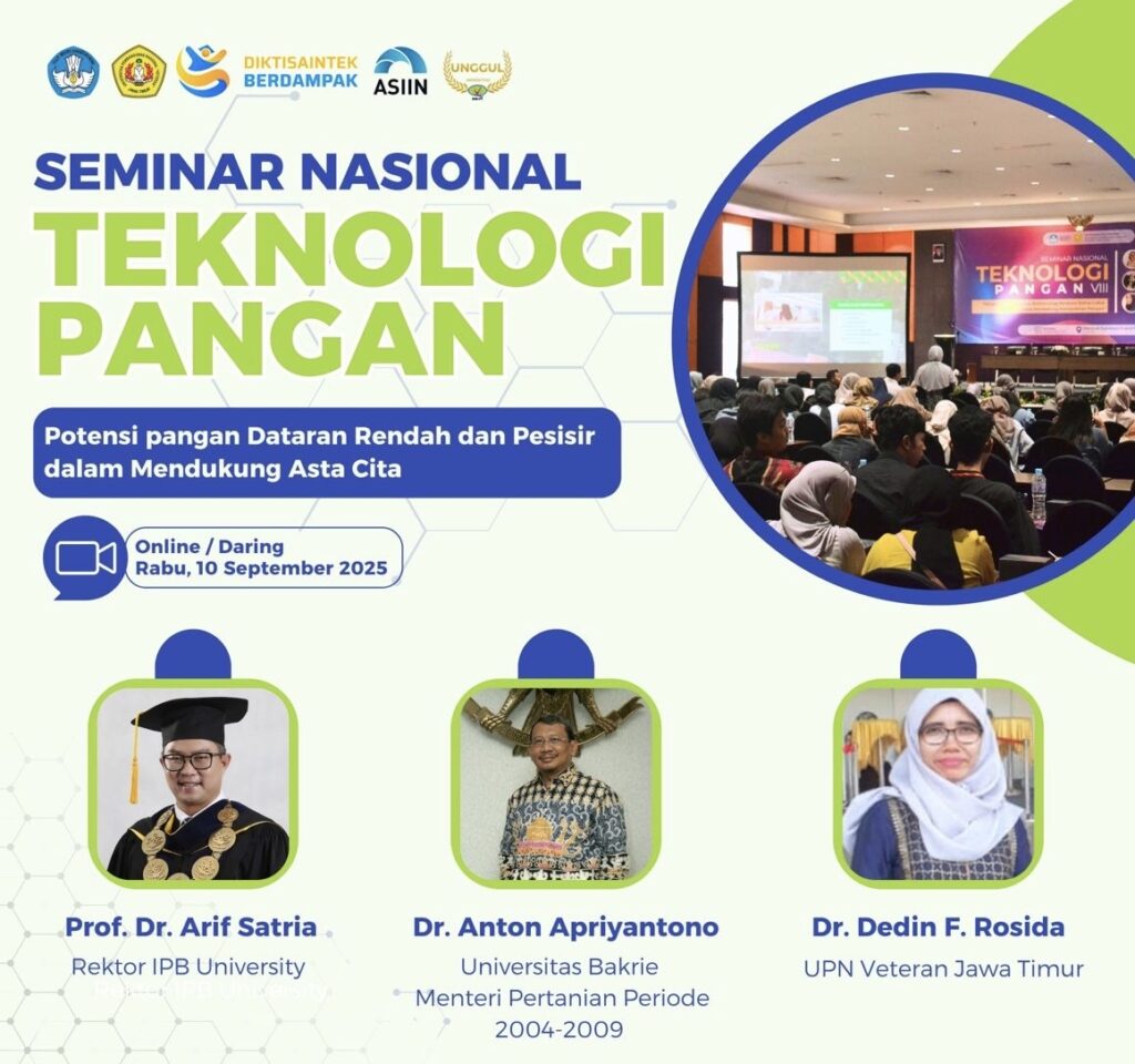 Rektor IPB University, Prof. Dr. Arif Satria, menjadi narasumber dalam Seminar Nasional yang diselenggarakan oleh Universitas Pembangunan Nasional (UPN) Veteran Jawa Timur, dengan tema “Potensi Pangan Dataran Rendah dan Pesisir dalam Mendukung Program Asta Cita”, Rabu (10/9/2025). Dalam kesempatan tersebut, Prof. Arif memberikan paparan bertajuk “Ketahanan Pangan sebagai Isu Strategis Nasional”.